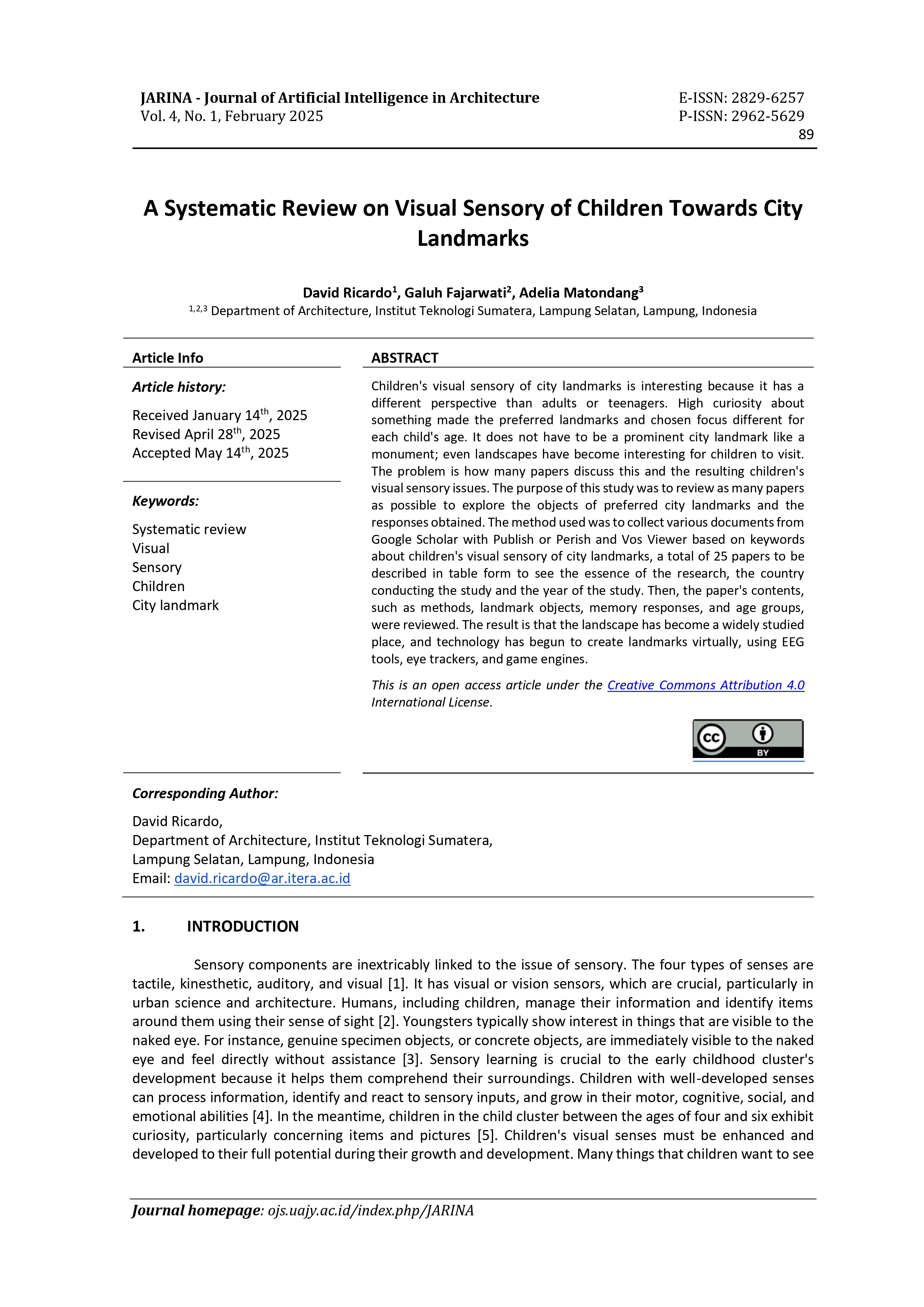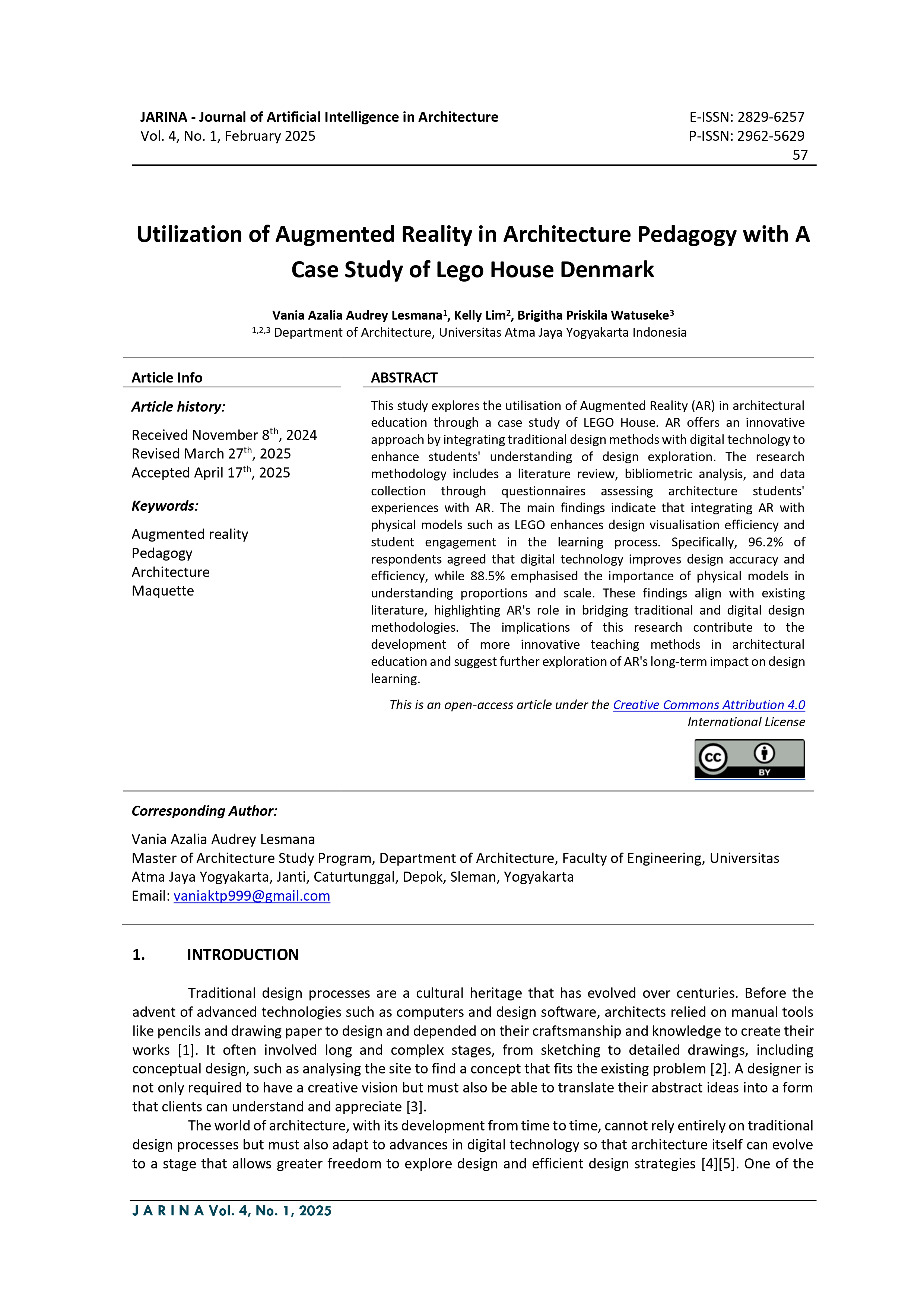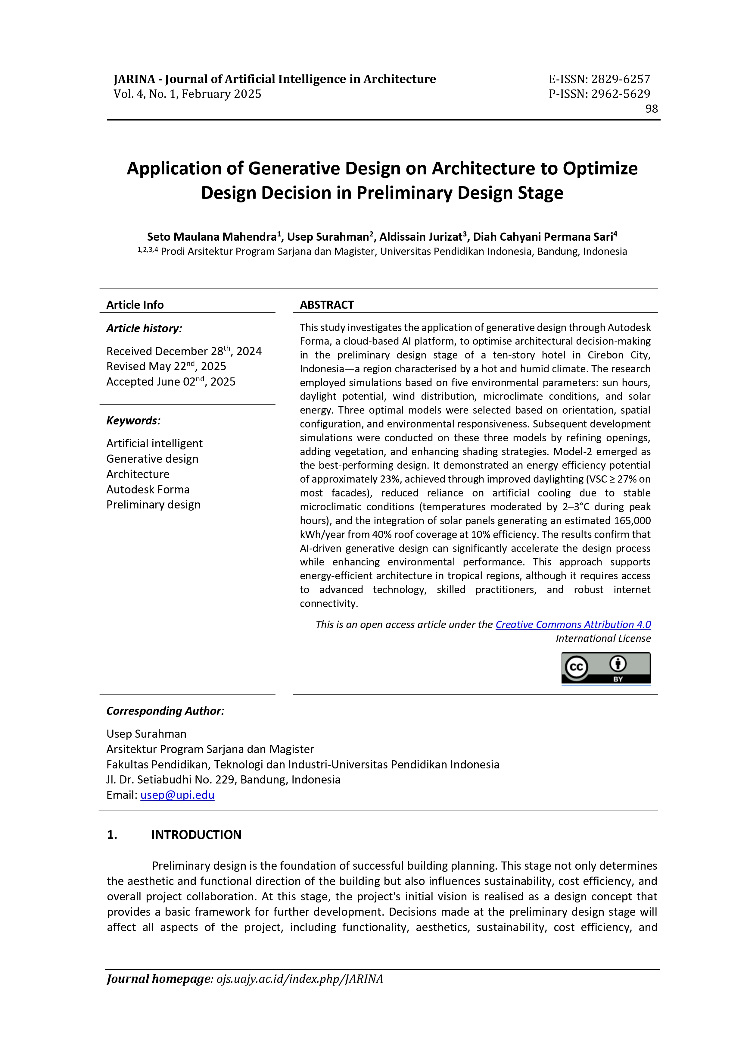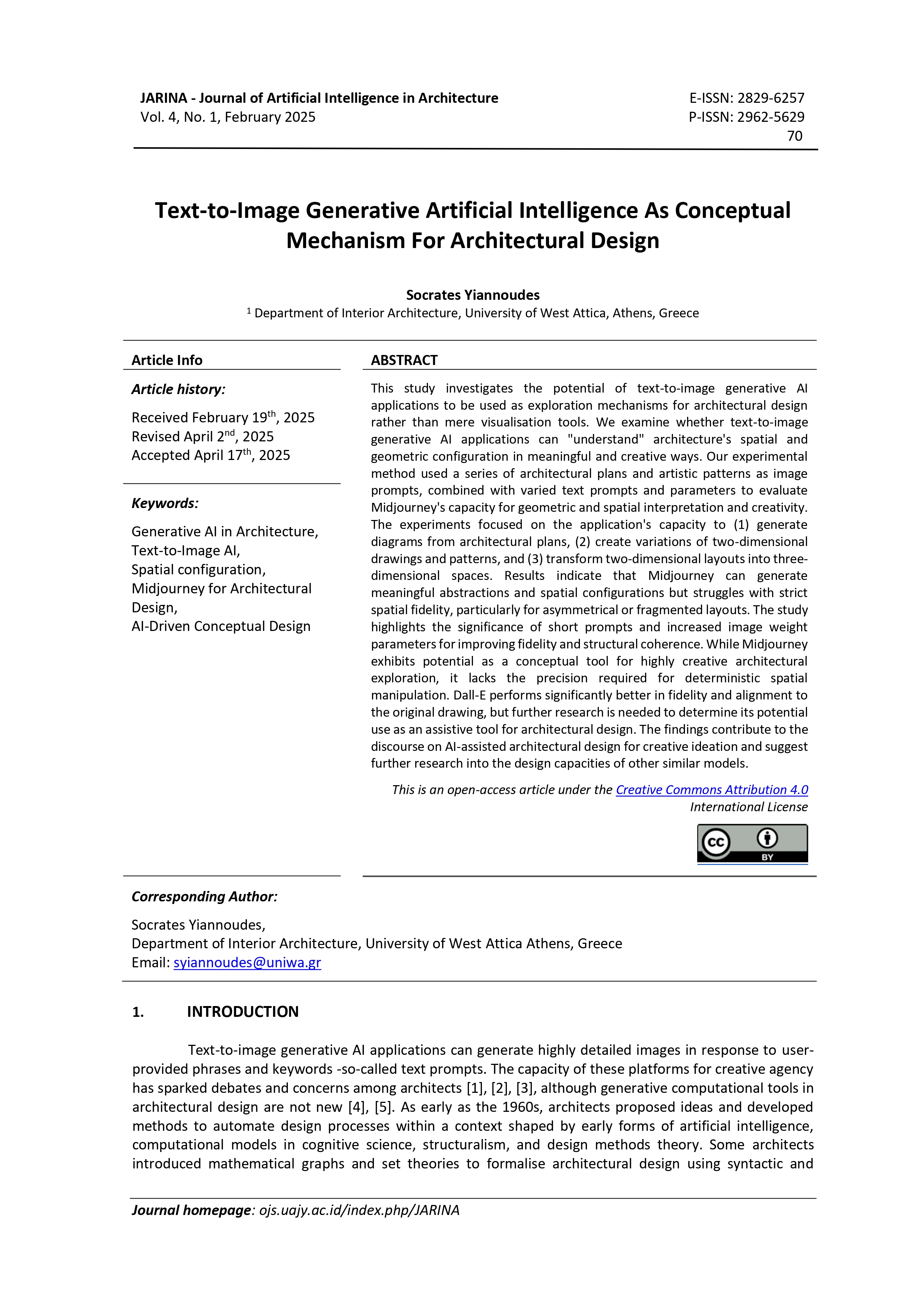 We proudly announce that JARINA (Journal of Artificial Intelligence in Architecture) Vol. 4 No 1, 2025 has been published (February, 2025) with topic title